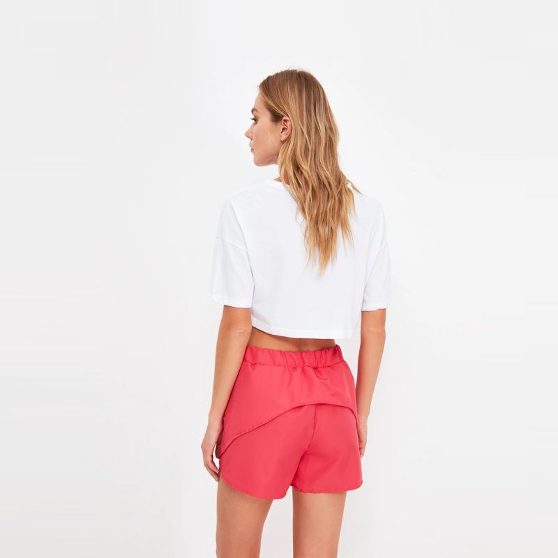 شورت وردي متوسط الارتفاع ، مع حزام خصر مطاطي.