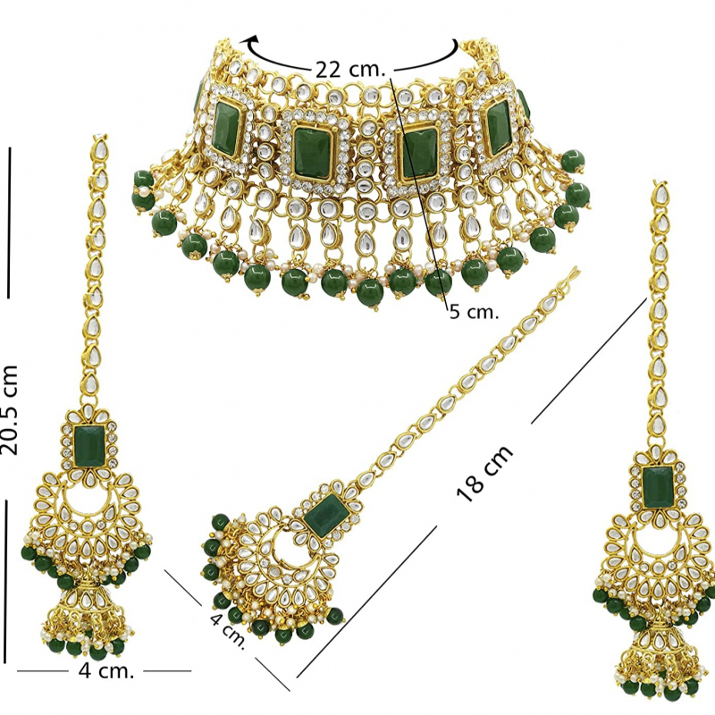 • Womens Gold Plated Alloy Jewellery Set - Green; Contains : 1 Necklace + 1 Pair of Earring + 1 Maang Tikka