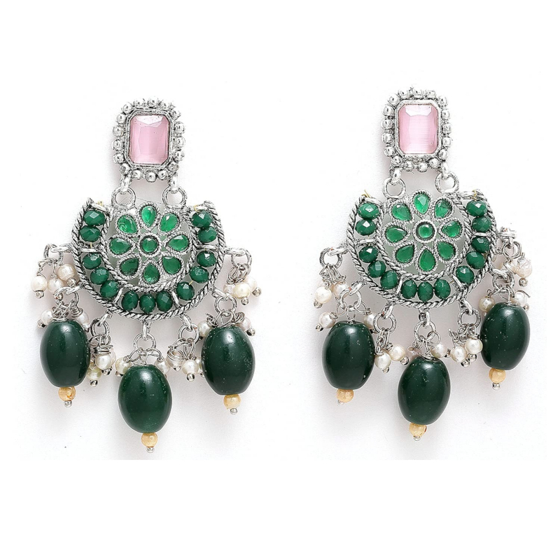 Silver Plated Green & Pink Stone-Studded Traditional Choker Necklace With Earrings Jewellery